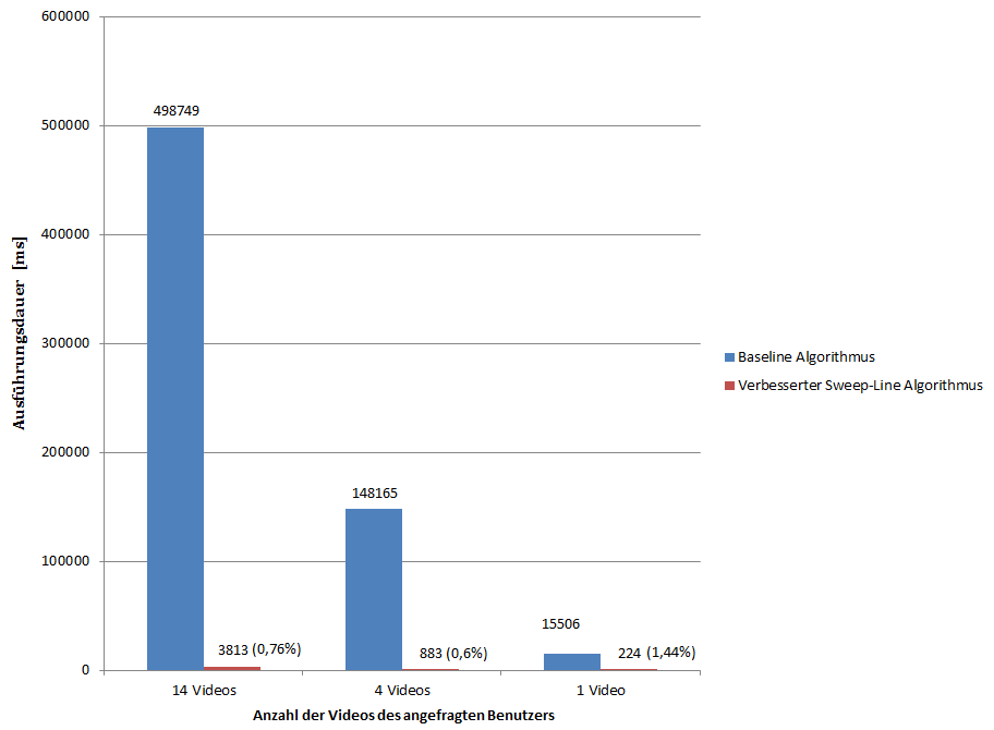 Es ist zu erkennen, dass sich die Verbesserungen deutlich auf die Ausführungsdauer des Algorhtmuses auswirken. Alle drei Zeiten des verbesserten Algorhtmuses liegen unter 4 Sekunden, wobei die Zeit mit der Anzahl der Videos, die der User selber aufgenommen hat, deutlich ansteigt.