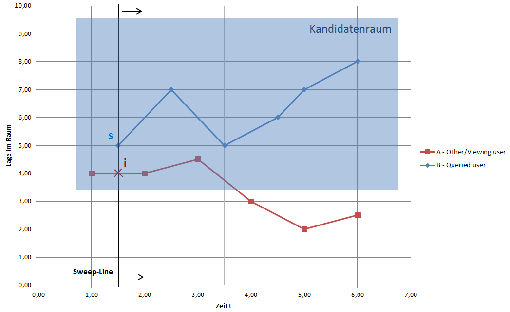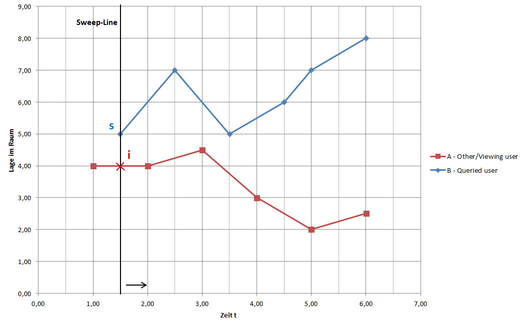 Deshalb läuft die Sweep-Line auch in der zeitlichen Dimension von links nach rechts. Nichtsdestotrotz kann diese Monotonie auch dafür genutzt werden, die zeitlich umschließden